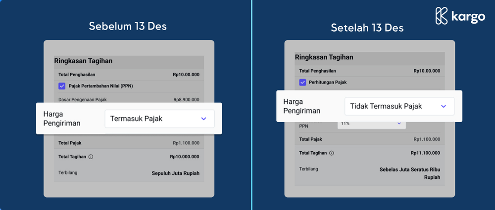 Berdasarkan Peraturan Pemerintah Nomor 49 Tahun 2022 tentang Pajak Pertambahan Nilai, untuk mempermudah perhitungan pendapatan bersih dan pemotongan pajak bagi Transporter Kargo Technologies, kami melakukan penyesuaian terhadap perhitungan PPN atas harga pengiriman Transporter Kargo Technologies.